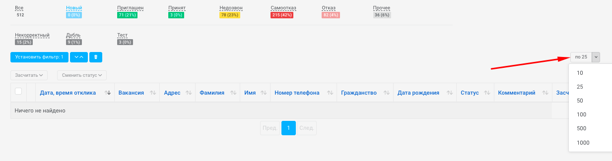Стандартное количество отображаемых лидов на странице - 25. Это количество можно увеличить до 50, 100, 500 и 1000 в правом верхнем углу [рис. 6]